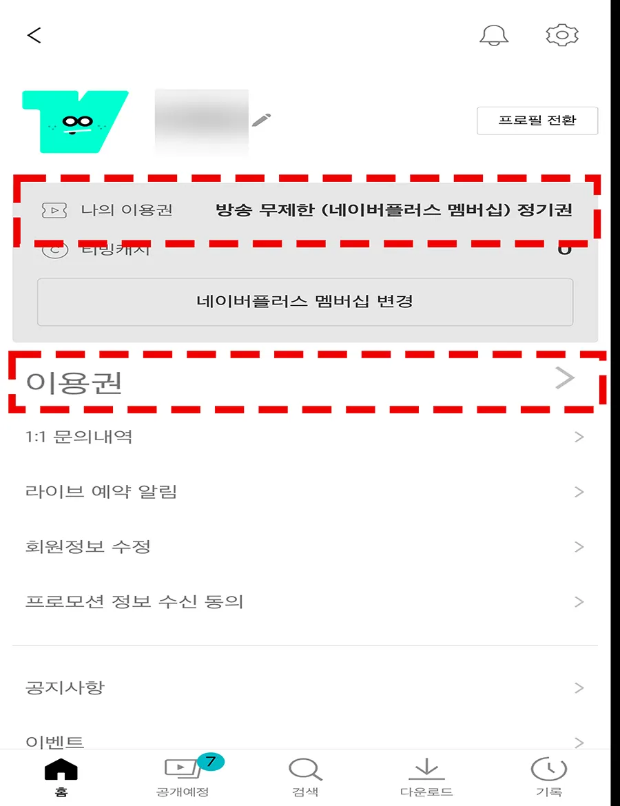 방송 무제한 (네이버플러스 멤버십) 정기권을 등록 후 사용하는 경우이다