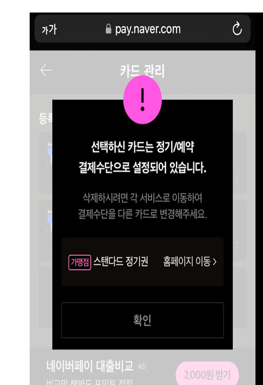 Tving 결제권 네이버페이를 통해 이용권을 구입한 경우이고, Card가 바뀌면서 네이버페이에서 카드를 다시 등록하고 기존 카드를 삭제하려고 하는데 Tving 정기 결제수단으로 등록되어 있어서 삭제가 안되고 구입 방법을 바꾸고 싶은 경우에는 해결방법으로는?